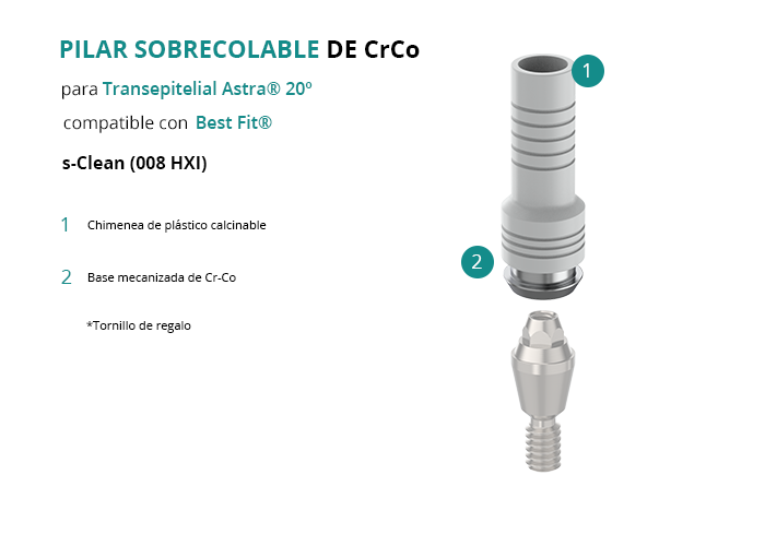 El Pilar Calcinable con Base de Cr-Co de GT-Medical es compatible con la línea de implantes s-Clean (008 HXI) de la marca Best Fit®, proporciona una base sólida para la estructura protésica y garantiza un ajuste óptimo con el Transepitelial Astra® 20º. Está formado por una base mecanizada de Cromo Cobalto y una chimenea de plástico calcinable.