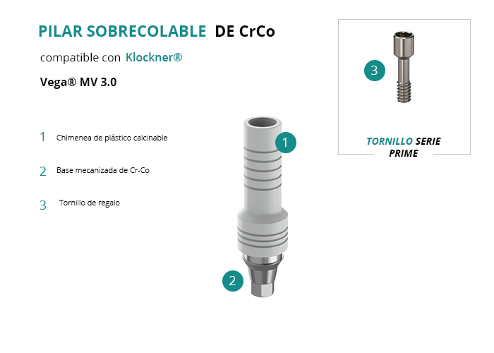 El Pilar Calcinable con Base de Cr-Co de GT-Medical es compatible con la línea de implantes Vega® MV 3.0 de la marca Klockner®, proporciona una base sólida para la estructura protésica y garantiza un ajuste óptimo con el implante. Está formado por una base mecanizada de Cromo Cobalto y una chimenea de plástico calcinable.