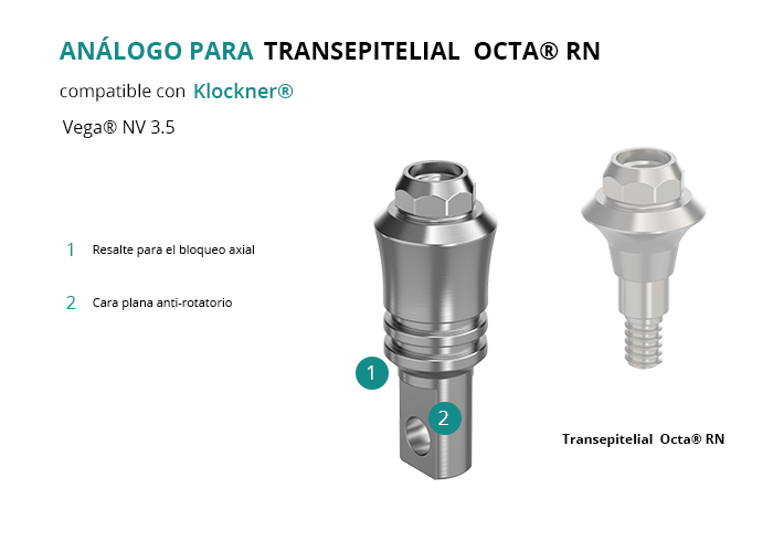 El análogo es una herramienta esencial para reproducir la geometría funcional del Transepitelial Octa® RN, facilitando tanto la confección de restauraciones tradicionales como digitales. Es compatible con implantes Klockner® de la plataforma Vega® NV 3.5, asegurando resultados óptimos en restauraciones protésicas sobre implantes.