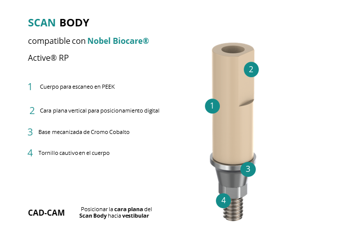 El Scan Body de GT-Medical es compatible con los implantes Active® RP de Nobel Biocare®, permitiendo una digitalización precisa de la posición del implante dental para su posterior diseño en un software CAD Dental. Está compuesto por un cuerpo de escaneo de PEEK, una base mecanizada de CrCo y un tornillo de Titanio Grado 5. Esta base mecanizada garantiza un ajuste óptimo con el implante, mientras que su naturaleza metálica radiopaca facilita la visualización en radiografías, asegurando así un posicionamiento correcto del scan body. Ideal para flujos intraorales y extraorales. Consulte las librerías disponibles para exocad y 3shape en el apartado de librerías relacionadas del producto.