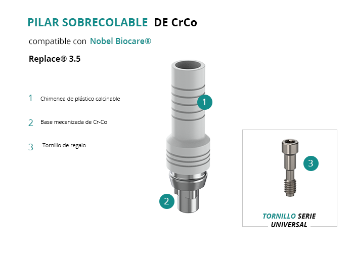 Pilar Sobrecolable de CrCo compatible con Nobel Biocare® Replace® 3.5