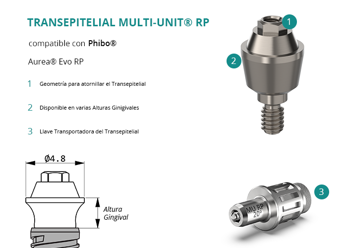 El Transepitelial Multi-Unit® RP de GT-Medical es compatible con los implantes Aurea® Evo RP de Phibo®, proporcionando una conexión duradera y estable para restauraciones múltiples. Tiene un diámetro de 4.8mm, y está fabricado en Titanio de Grado 5, garantiza una alta resistencia, biocompatibilidad y durabilidad en las restauraciones sobre implantes. Su diseño incluye varias alturas gingivales, lo que facilita la adaptación en diferentes perfiles de tejidos blandos y garantiza una estética óptima.