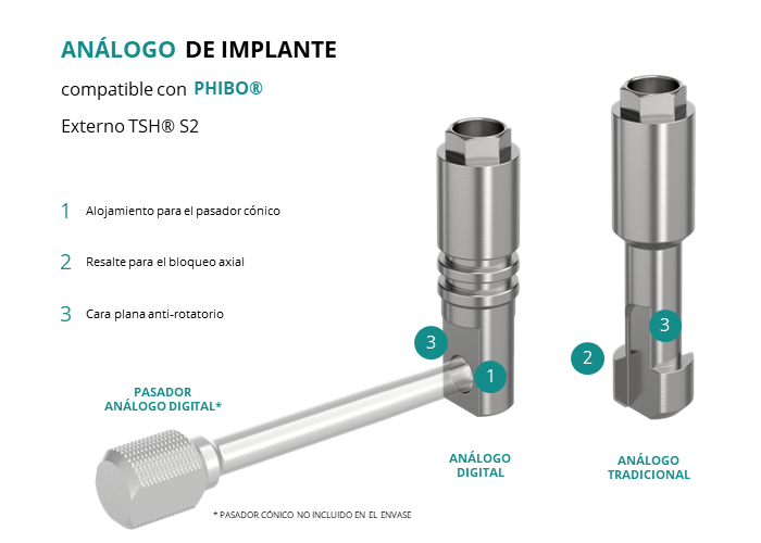 El análogo de GT-Medical compatible con la línea de implantes Externo TSH® S2 de la marca Phibo®, está fabricado en Acero Inoxidable, tiene un diámetro de 3.3mm, y replica con exactitud la conexión de este implante de Phibo®.
