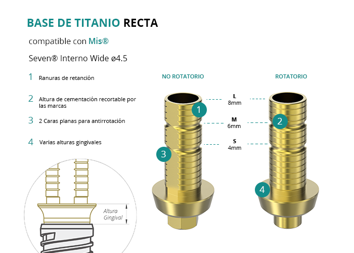 Las Ti-Base Rectas de GT-Medical son compatibles con los implantes Seven® Interno Wide Ø4.5 de Mis®, permitiendo una conexión estable y duradera entre el implante y la prótesis. Están compuestas en su totalidad por Titanio de Grado 5 con un anodizado dorado para un acabado más estético. Poseen un tronco de cementación recortable a varias alturas, 2 caras planas para realizar la función antirotativa y un cuerpo gingival de varias alturas, dependiendo del tipo de conexión.