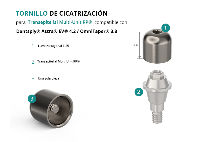 GT-Medical ofrece un Tornillo de Cicatrización para el Transepitelial Multi-Unit® RP (tipo Nobel®) compatible con la línea de implantes Astra® EV® 4.2 / OmniTaper® 3.8 de la marca Dentsply®, está fabricado en Titanio Grado 5, tiene un diámetro de 4.8mm, y una altura total de 4.6mm.