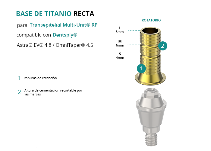 Las Ti-Base Rectas de GT-Medical son compatibles con los implantes Astra® EV® 4.8 / OmniTaper® 4.5 de Dentsply®, permitiendo una conexión estable y duradera entre el Transepitelial Multi-Unit® RP y la prótesis. Están compuestas en su totalidad por Titanio de Grado 5 con un anodizado dorado para un acabado más estético. Poseen un tronco de cementación ranurado y recortable a varias alturas.