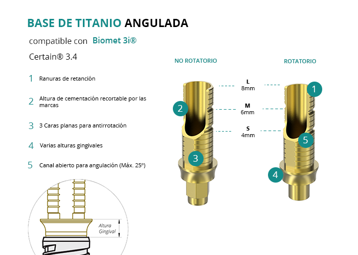 Las Ti-Base Anguladas de GT-Medical son compatibles con los implantes Certain® 3.4 de Biomet 3i®, facilitando una conexión estable y duradera entre el implante y la prótesis, y permitiendo corregir angulaciones de hasta 25 grados. Están compuestas en su totalidad por Titanio de Grado 5 con un anodizado dorado para un acabado más estético. Poseen un tronco de cementación recortable a varias alturas con canal abierto para permitir angulación, 3 caras planas para realizar la función antirotativa y un cuerpo gingival de varias alturas, dependiendo del tipo de conexión.