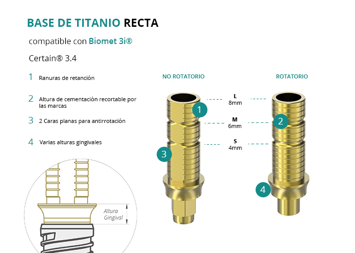 Las Ti-Base Rectas de GT-Medical son compatibles con los implantes Certain® 3.4 de Biomet 3i®, permitiendo una conexión estable y duradera entre el implante y la prótesis. Están compuestas en su totalidad por Titanio de Grado 5 con un anodizado dorado para un acabado más estético. Poseen un tronco de cementación recortable a varias alturas, 2 caras planas para realizar la función antirotativa y un cuerpo gingival de varias alturas, dependiendo del tipo de conexión.
