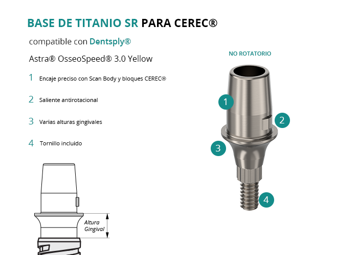 Las Bases de Titanio SR para CEREC® de GT-Medical son compatibles con los implantes Astra® OsseoSpeed® 3.0 Yellow de Dentsply®, fabricadas en Titanio de Grado 5 para una conexión precisa y duradera. Cuentan con un saliente antirotacional que asegura el encaje perfecto con los scan bodies y bloques fresables de CEREC, evitando la rotación. Están disponibles en diversas alturas gingivales para adaptarse a cada caso. El tornillo está incluido en el envase.