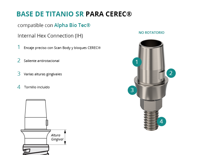 Las Bases de Titanio SR para CEREC® de GT-Medical son compatibles con los implantes Internal Hex Connection (IH) de Alpha Bio Tec®, fabricadas en Titanio de Grado 5 para una conexión precisa y duradera. Cuentan con un saliente antirotacional que asegura el encaje perfecto con los scan bodies y bloques fresables de CEREC, evitando la rotación. Están disponibles en diversas alturas gingivales para adaptarse a cada caso. El tornillo está incluido en el envase.