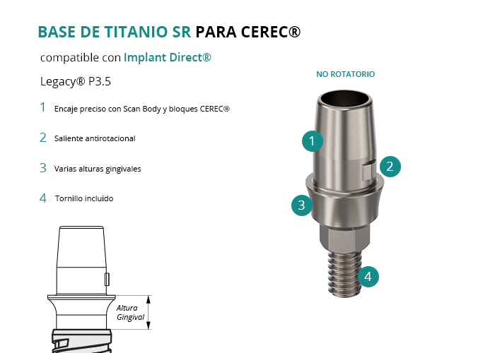 Las Bases de Titanio SR para CEREC® de GT-Medical son compatibles con los implantes Legacy® P3.5 de Implant Direct®, fabricadas en Titanio de Grado 5 para una conexión precisa y duradera. Cuentan con un saliente antirotacional que asegura el encaje perfecto con los scan bodies y bloques fresables de CEREC, evitando la rotación. Están disponibles en diversas alturas gingivales para adaptarse a cada caso. El tornillo está incluido en el envase.