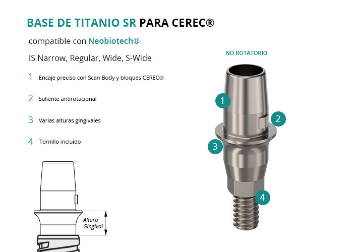 Base de Titanio SR para Cerec® compatible con Neobiotech® IS Narrow, Regular, Wide, S-Wide
