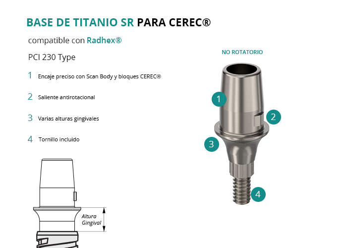 Las Bases de Titanio SR para CEREC® de GT-Medical son compatibles con los implantes PCI 230 Type de Radhex®, fabricadas en Titanio de Grado 5 para una conexión precisa y duradera. Cuentan con un saliente antirotacional que asegura el encaje perfecto con los scan bodies y bloques fresables de CEREC, evitando la rotación. Están disponibles en diversas alturas gingivales para adaptarse a cada caso. El tornillo está incluido en el envase.