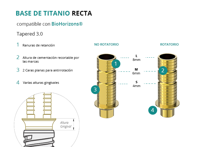 Las Ti-Base Rectas de GT-Medical son compatibles con los implantes Tapered 3.0 de BioHorizons®, permitiendo una conexión estable y duradera entre el implante y la prótesis. Están compuestas en su totalidad por Titanio de Grado 5 con un anodizado dorado para un acabado más estético. Poseen un tronco de cementación recortable a varias alturas, 2 caras planas para realizar la función antirotativa y un cuerpo gingival de varias alturas, dependiendo del tipo de conexión.