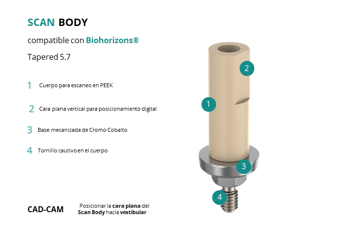 - CAD-CAM: Posicionar la cara plana del Scan Body hacia vestibular.