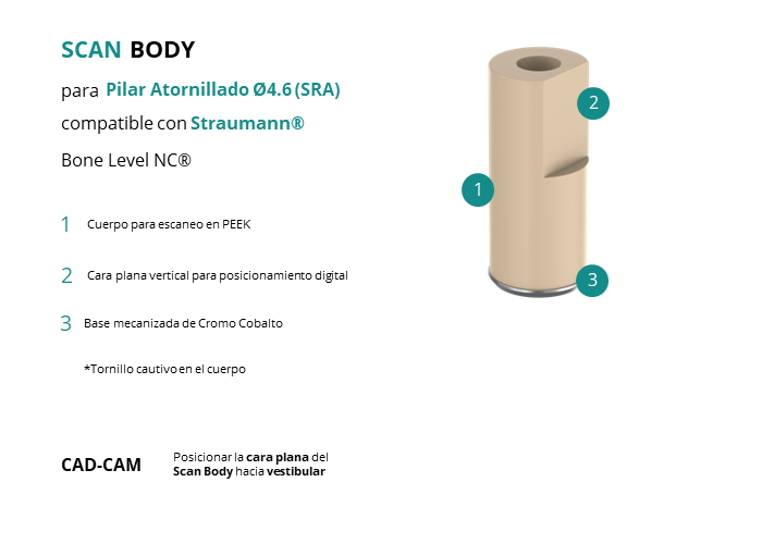 - CAD-CAM: Posicionar la cara plana del Scan Body hacia vestibular.