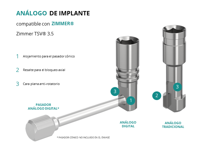 El análogo de GT-Medical compatible con la línea de implantes Zimmer TSV® 3.5 de la marca Zimmer®, está fabricado en Acero Inoxidable, tiene un diámetro de 3.5mm, y replica con exactitud la conexión de este implante de Zimmer®.