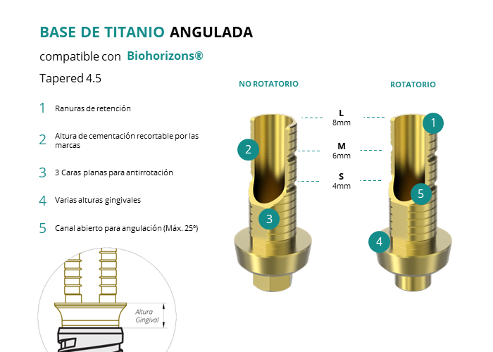 Las Ti-Base Anguladas de GT-Medical son compatibles con los implantes Tapered 4.5 de Biohorizons®, facilitando una conexión estable y duradera entre el implante y la prótesis, y permitiendo corregir angulaciones de hasta 25 grados. Están compuestas en su totalidad por Titanio de Grado 5 con un anodizado dorado para un acabado más estético. Poseen un tronco de cementación recortable a varias alturas con canal abierto para permitir angulación, 3 caras planas para realizar la función antirotativa y un cuerpo gingival de varias alturas, dependiendo del tipo de conexión.