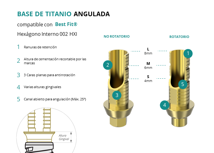Las Ti-Base Anguladas de GT-Medical son compatibles con los implantes Hexágono Interno 002 HXI de Best Fit®, facilitando una conexión estable y duradera entre el implante y la prótesis, y permitiendo corregir angulaciones de hasta 25 grados. Están compuestas en su totalidad por Titanio de Grado 5 con un anodizado dorado para un acabado más estético. Poseen un tronco de cementación recortable a varias alturas con canal abierto para permitir angulación, 3 caras planas para realizar la función antirotativa y un cuerpo gingival de varias alturas, dependiendo del tipo de conexión.