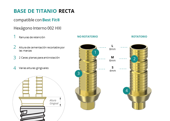Las Ti-Base Rectas de GT-Medical son compatibles con los implantes Hexágono Interno 002 HXI de Best Fit®, permitiendo una conexión estable y duradera entre el implante y la prótesis. Están compuestas en su totalidad por Titanio de Grado 5 con un anodizado dorado para un acabado más estético. Poseen un tronco de cementación recortable a varias alturas, 2 caras planas para realizar la función antirotativa y un cuerpo gingival de varias alturas, dependiendo del tipo de conexión.