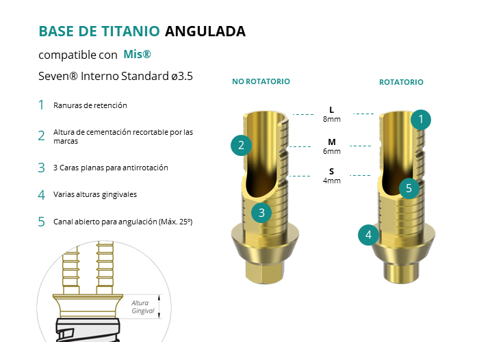 Las Ti-Base Anguladas de GT-Medical son compatibles con los implantes Seven® Interno Standard Ø3.5 de Mis®, facilitando una conexión estable y duradera entre el implante y la prótesis, y permitiendo corregir angulaciones de hasta 25 grados. Están compuestas en su totalidad por Titanio de Grado 5 con un anodizado dorado para un acabado más estético. Poseen un tronco de cementación recortable a varias alturas con canal abierto para permitir angulación, 3 caras planas para realizar la función antirotativa y un cuerpo gingival de varias alturas, dependiendo del tipo de conexión.