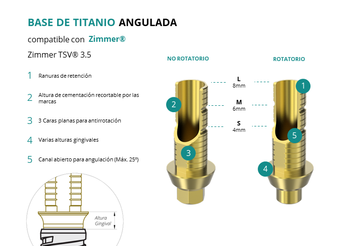 Las Ti-Base Anguladas de GT-Medical son compatibles con los implantes Zimmer TSV® 3.5 de Zimmer®, facilitando una conexión estable y duradera entre el implante y la prótesis, y permitiendo corregir angulaciones de hasta 25 grados. Están compuestas en su totalidad por Titanio de Grado 5 con un anodizado dorado para un acabado más estético. Poseen un tronco de cementación recortable a varias alturas con canal abierto para permitir angulación, 3 caras planas para realizar la función antirotativa y un cuerpo gingival de varias alturas, dependiendo del tipo de conexión.