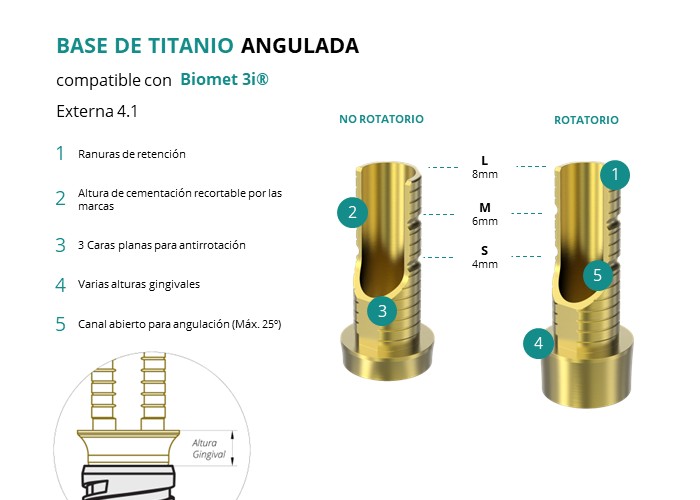 Las Ti-Base Anguladas de GT-Medical son compatibles con los implantes Externa 4.1 de Biomet 3i®, facilitando una conexión estable y duradera entre el implante y la prótesis, y permitiendo corregir angulaciones de hasta 25 grados. Están compuestas en su totalidad por Titanio de Grado 5 con un anodizado dorado para un acabado más estético. Poseen un tronco de cementación recortable a varias alturas con canal abierto para permitir angulación, 3 caras planas para realizar la función antirotativa y un cuerpo gingival de varias alturas, dependiendo del tipo de conexión.