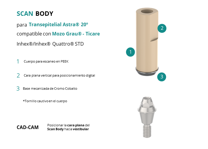 Scan Body para Transepitelial Astra® 20� compatible con Mozo Grau® - Ticare Inhex®/Inhex® Quattro® STD
