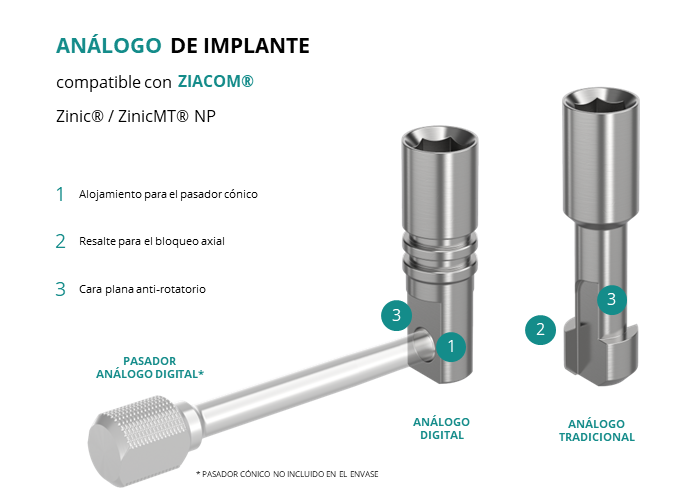 El análogo de GT-Medical compatible con la línea de implantes Zinic® / ZinicMT® NP de la marca Ziacom®, está fabricado en Acero Inoxidable, tiene un diámetro de 3.3mm, y replica con exactitud la conexión de este implante de Ziacom®.