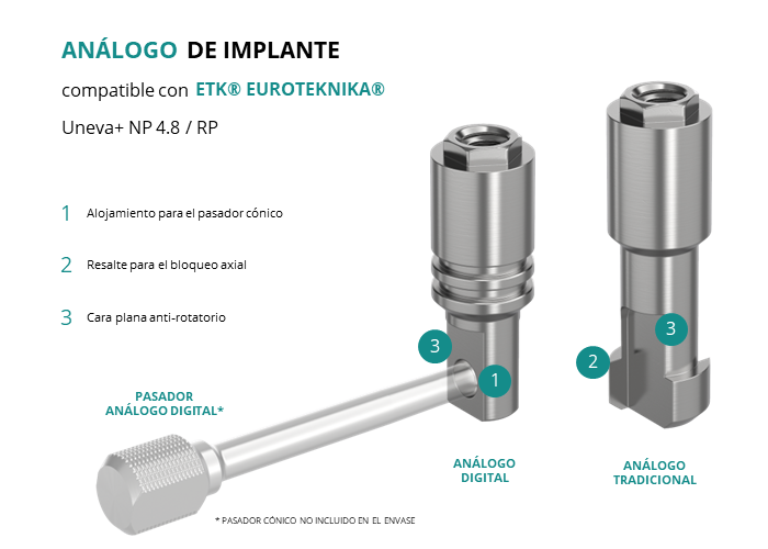 El análogo de GT-Medical compatible con la línea de implantes Uneva+ NP 4.8 / RP de la marca Etk® Euroteknika®, está fabricado en Acero Inoxidable, tiene un diámetro de 4.1mm, y replica con exactitud la conexión de este implante de Etk® Euroteknika®.