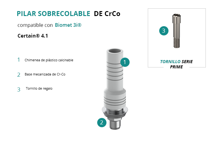 Pilar Sobrecolable de CrCo compatible con Biomet 3i® Certain® 4.1