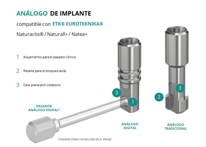 El análogo de GT-Medical compatible con la línea de implantes Naturactis® / Naturall+ / Natea+ de la marca Etk® Euroteknika®, está fabricado en Acero Inoxidable, tiene un diámetro de 3.5mm, y replica con exactitud la conexión de este implante de Etk® Euroteknika®.