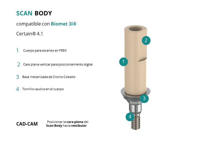 - CAD-CAM: Posicionar la cara plana del Scan Body hacia vestibular.