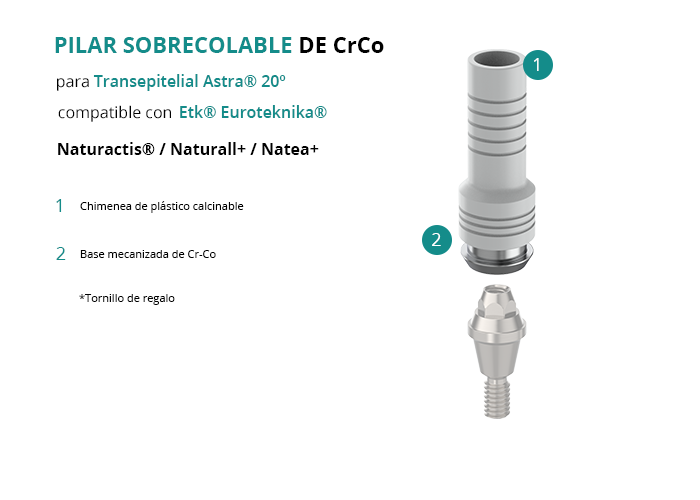 El Pilar Calcinable con Base de Cr-Co de GT-Medical es compatible con la línea de implantes Naturactis® / Naturall+ / Natea+ de la marca Etk® Euroteknika®, proporciona una base sólida para la estructura protésica y garantiza un ajuste óptimo con el Transepitelial Astra® 20º​. Está formado por una base mecanizada de Cromo Cobalto y una chimenea de plástico calcinable.