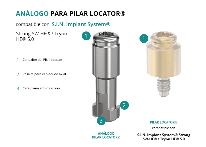 El análogo para Pilar Locator® es fundamental para crear el modelo de una restauración de sobredentadura removible que utilice pilares Locator® sobre implantes, como por ejemplo los de S.I.N. Implant System® de plataforma Strong SW-HE® / Tryon HE® 5.0.