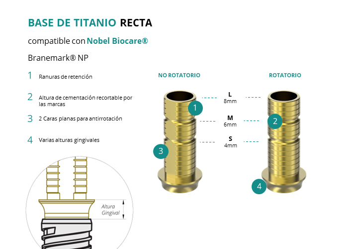 Las Ti-Base Rectas de GT-Medical son compatibles con los implantes Branemark® NP de Nobel Biocare®, permitiendo una conexión estable y duradera entre el implante y la prótesis. Están compuestas en su totalidad por Titanio de Grado 5 con un anodizado dorado para un acabado más estético. Poseen un tronco de cementación recortable a varias alturas, 2 caras planas para realizar la función antirotativa y un cuerpo gingival de varias alturas, dependiendo del tipo de conexión.