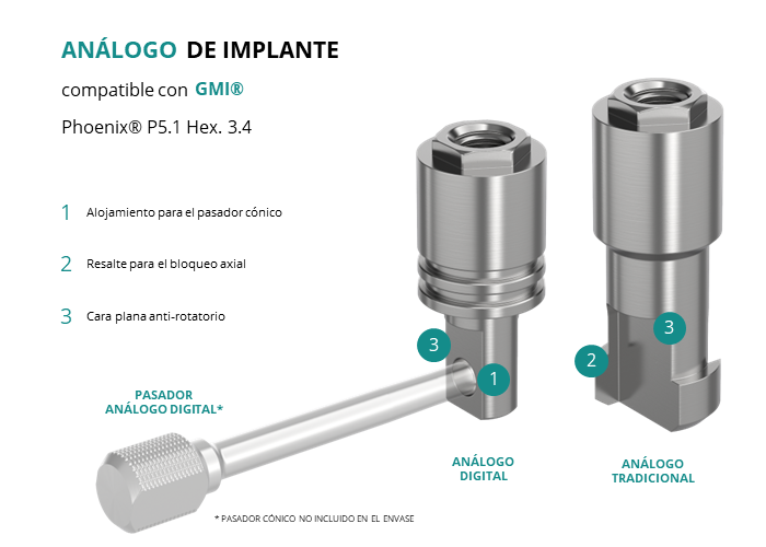 El análogo de GT-Medical compatible con la línea de implantes Phoenix® P5.1 Hex. 3.4 de la marca Gmi®, está fabricado en Acero Inoxidable, tiene un diámetro de 5.1mm, y replica con exactitud la conexión de este implante de Gmi®.