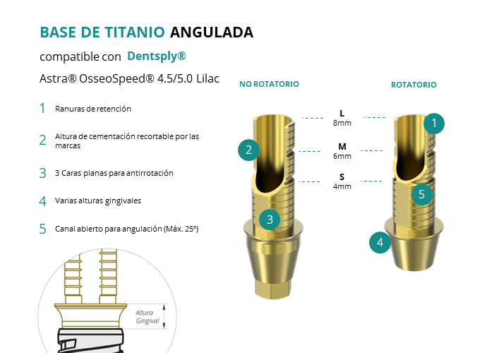 Las Ti-Base Anguladas de GT-Medical son compatibles con los implantes Astra® OsseoSpeed® 4.5/5.0 Lilac de Dentsply®, facilitando una conexión estable y duradera entre el implante y la prótesis, y permitiendo corregir angulaciones de hasta 25 grados. Están compuestas en su totalidad por Titanio de Grado 5 con un anodizado dorado para un acabado más estético. Poseen un tronco de cementación recortable a varias alturas con canal abierto para permitir angulación, 3 caras planas para realizar la función antirotativa y un cuerpo gingival de varias alturas, dependiendo del tipo de conexión.