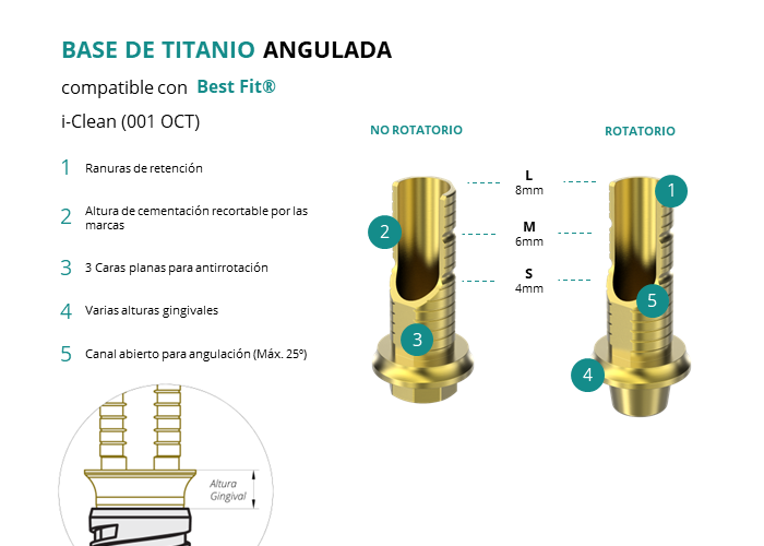 Las Ti-Base Anguladas de GT-Medical son compatibles con los implantes i-Clean (001 OCT) de Best Fit®, facilitando una conexión estable y duradera entre el implante y la prótesis, y permitiendo corregir angulaciones de hasta 25 grados. Están compuestas en su totalidad por Titanio de Grado 5 con un anodizado dorado para un acabado más estético. Poseen un tronco de cementación recortable a varias alturas con canal abierto para permitir angulación, 3 caras planas para realizar la función antirotativa y un cuerpo gingival de varias alturas, dependiendo del tipo de conexión.