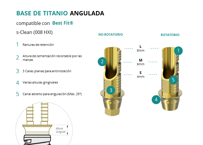 Las Ti-Base Anguladas de GT-Medical son compatibles con los implantes s-Clean (008 HXI) de Best Fit®, facilitando una conexión estable y duradera entre el implante y la prótesis, y permitiendo corregir angulaciones de hasta 25 grados. Están compuestas en su totalidad por Titanio de Grado 5 con un anodizado dorado para un acabado más estético. Poseen un tronco de cementación recortable a varias alturas con canal abierto para permitir angulación, 3 caras planas para realizar la función antirotativa y un cuerpo gingival de varias alturas, dependiendo del tipo de conexión.