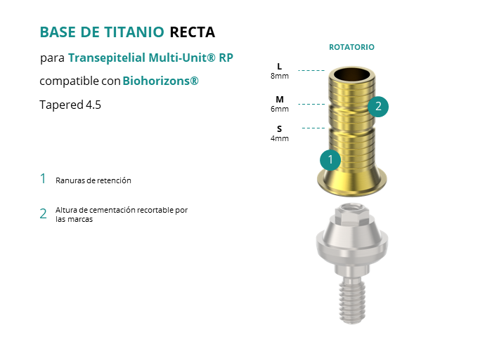 Las Ti-Base Rectas de GT-Medical son compatibles con los implantes Tapered 4.5 de Biohorizons®, permitiendo una conexión estable y duradera entre el Transepitelial Multi-Unit® RP y la prótesis. Están compuestas en su totalidad por Titanio de Grado 5 con un anodizado dorado para un acabado más estético. Poseen un tronco de cementación ranurado y recortable a varias alturas.