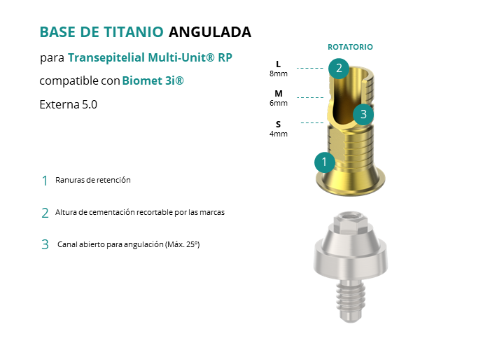 Las Ti-Base Anguladas de GT-Medical son compatibles con los implantes Externa 5.0 de Biomet 3i®, lo que asegura una conexión estable y duradera entre el Transepitelial Multi-Unit® RP y la prótesis, permitiendo además corregir angulaciones de hasta 25 grados. Están compuestas en su totalidad por Titanio de Grado 5 con un anodizado dorado para un acabado más estético. Poseen un tronco de cementación ranurado y recortable a varias alturas.