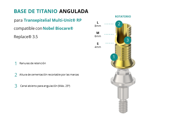 Las Ti-Base Anguladas de GT-Medical son compatibles con los implantes Replace® 3.5 de Nobel Biocare®, lo que asegura una conexión estable y duradera entre el Transepitelial Multi-Unit® RP y la prótesis, permitiendo además corregir angulaciones de hasta 25 grados. Están compuestas en su totalidad por Titanio de Grado 5 con un anodizado dorado para un acabado más estético. Poseen un tronco de cementación ranurado y recortable a varias alturas.