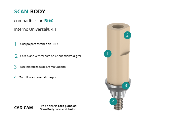 - CAD-CAM: Posicionar la cara plana del Scan Body hacia vestibular.