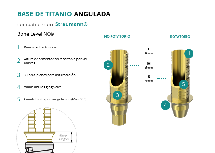 Las Ti-Base Anguladas de GT-Medical son compatibles con los implantes Bone Level NC® de Straumann®, facilitando una conexión estable y duradera entre el implante y la prótesis, y permitiendo corregir angulaciones de hasta 25 grados. Están compuestas en su totalidad por Titanio de Grado 5 con un anodizado dorado para un acabado más estético. Poseen un tronco de cementación recortable a varias alturas con canal abierto para permitir angulación, 3 caras planas para realizar la función antirotativa y un cuerpo gingival de varias alturas, dependiendo del tipo de conexión.