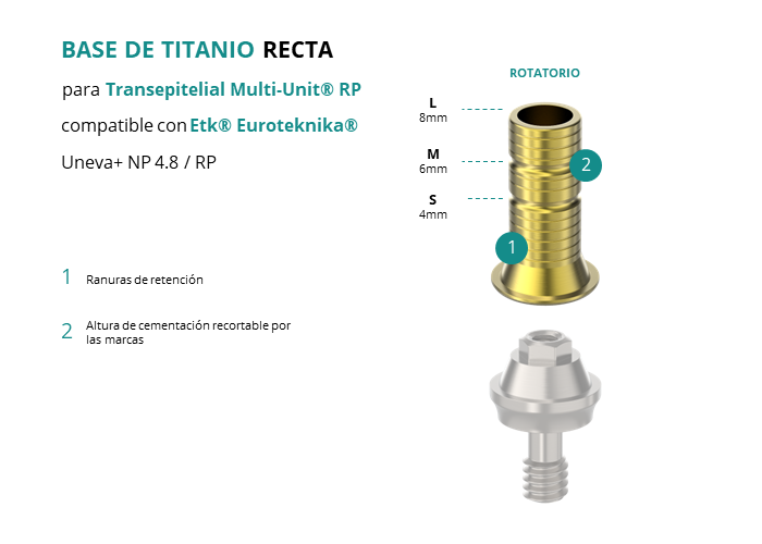 Las Ti-Base Rectas de GT-Medical son compatibles con los implantes Uneva+ NP 4.8 / RP de Etk® Euroteknika®, permitiendo una conexión estable y duradera entre el Transepitelial Multi-Unit® RP y la prótesis. Están compuestas en su totalidad por Titanio de Grado 5 con un anodizado dorado para un acabado más estético. Poseen un tronco de cementación ranurado y recortable a varias alturas.