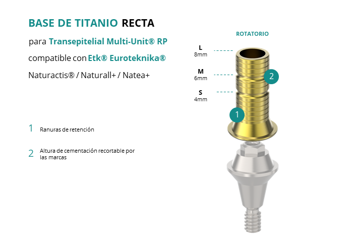 Las Ti-Base Rectas de GT-Medical son compatibles con los implantes Naturactis® / Naturall+ / Natea+ de Etk® Euroteknika®, permitiendo una conexión estable y duradera entre el Transepitelial Multi-Unit® RP y la prótesis. Están compuestas en su totalidad por Titanio de Grado 5 con un anodizado dorado para un acabado más estético. Poseen un tronco de cementación ranurado y recortable a varias alturas.