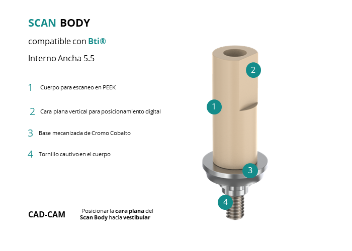 - CAD-CAM: Posicionar la cara plana del Scan Body hacia vestibular.