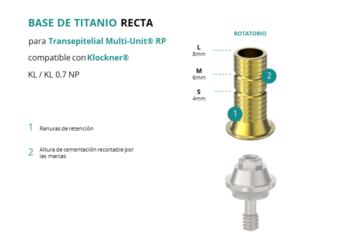 Las Ti-Base Rectas de GT-Medical son compatibles con los implantes KL / KL 0.7 NP de Klockner®, permitiendo una conexión estable y duradera entre el Transepitelial Multi-Unit® RP y la prótesis. Están compuestas en su totalidad por Titanio de Grado 5 con un anodizado dorado para un acabado más estético. Poseen un tronco de cementación ranurado y recortable a varias alturas.