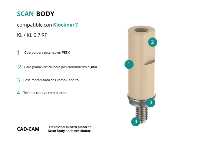 El Scan Body de GT-Medical es compatible con los implantes KL / KL 0.7 RP de Klockner®, permitiendo una digitalización precisa de la posición del implante dental para su posterior diseño en un software CAD Dental. Está compuesto por un cuerpo de escaneo de PEEK, una base mecanizada de CrCo y un tornillo de Titanio Grado 5. Esta base mecanizada garantiza un ajuste óptimo con el implante, mientras que su naturaleza metálica radiopaca facilita la visualización en radiografías, asegurando así un posicionamiento correcto del scan body. Ideal para flujos intraorales y extraorales. Consulte las librerías disponibles para exocad y 3shape en el apartado de librerías relacionadas del producto.